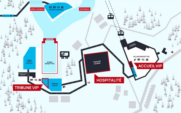 Das VIP-Zelt ist zu Fuss erreichbar und befindet sich gleich neben dem Ziel-Bereich. Hier findest du den Geländeplan. Dein Armband für den Zutritt in die Cisalpin Lounge sowie auf die Tribüne Valais bekommst du im Empfangszelt WELCOME CISALPIN VIP-LOUNGE im Village Barzettes. Bitte weise den QR-Code auf deinem Ticket vor.